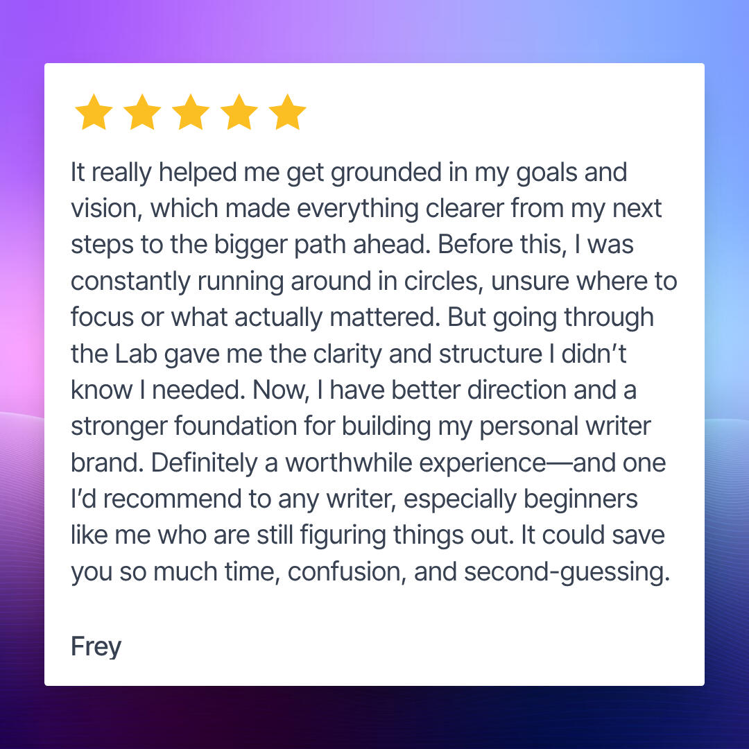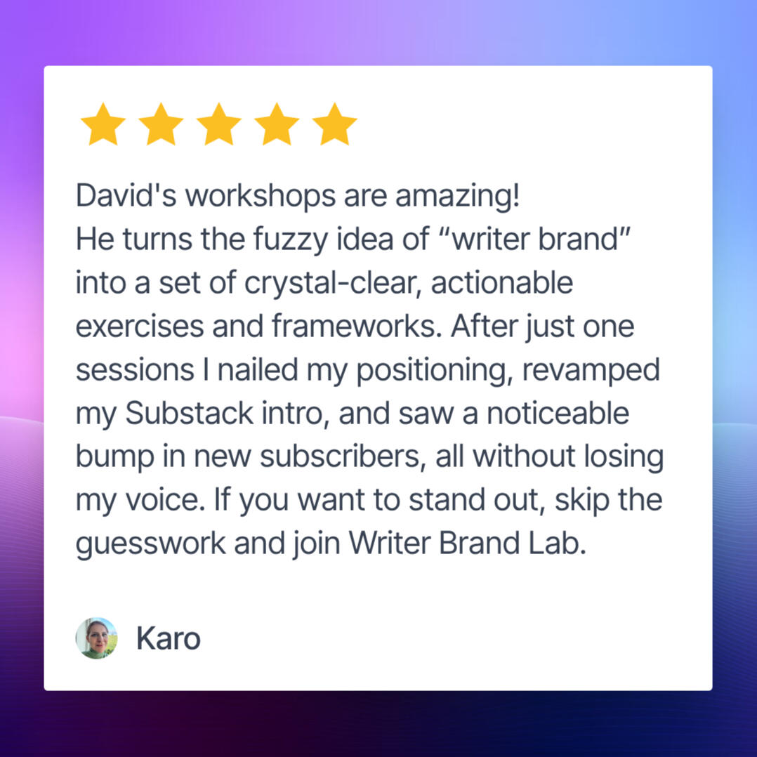 This programme is for writers who:• Have already published or posted content, but want their brand to feel solid.• Are serious about connecting writing to income.• Value accountability, feedback, and community over going it alone.• Want a supportive, focused environment without pressure or jargon.Why community is the difference:Clarity doesn’t come from working alone in the dark. It comes from reflection, feedback, and practice in front of others who get it.Inside Writer Brand Lab, you’ll:• Workshop ideas with a small group of peers.• Test your brand messaging in a safe, supportive space.• Learn from expert guests who’ve built their own brands successfully.It’s not just coaching.It’s community, and that’s where the transformation sticks.What you’ll walk away with:✅ A clear writer brand blueprint you can describe in one sentence.✅ A trust-building system for Substack, socials, and beyond.✅ A personalised monetisation roadmap tailored to your energy and audience.✅ A clear plan to keep growing with confidence.Your next chapter starts hereIf you’re ready to stop feeling scattered and start building a brand that readers remember, trust, and support, Writer Brand Lab is for you.
