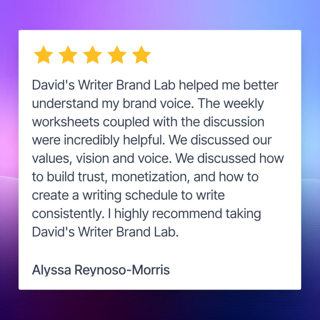Writer Brand Lab is a year-round community featuring a 4-month group cohort to help you:• Define your unique voice, niche, and audience• Build a trust-first presence across the platforms that matter• Turn reputation into revenue, without selling out• Create simple, sustainable systems to keep your brand aliveThis isn’t theory.You’ll walk away with a clear brand, an actionable plan, and the confidence to show up authentically.